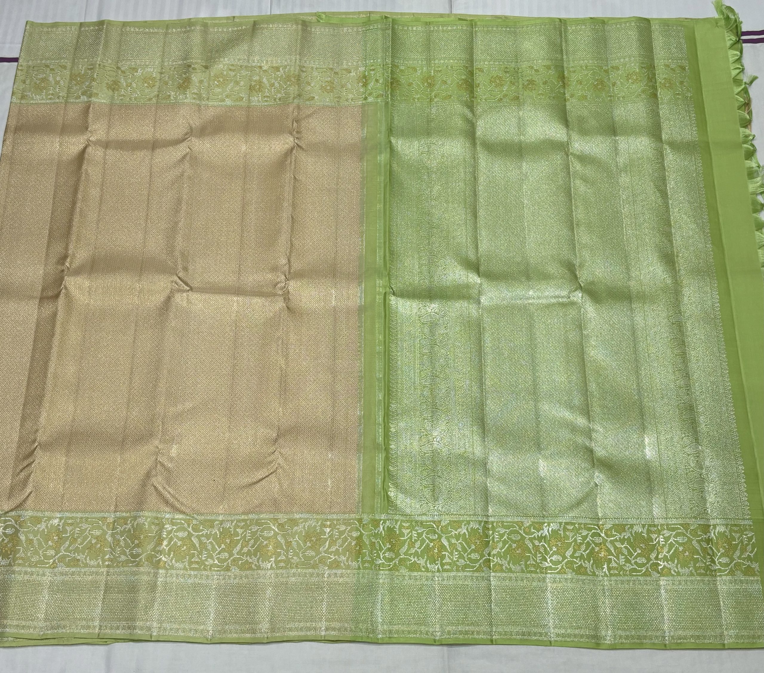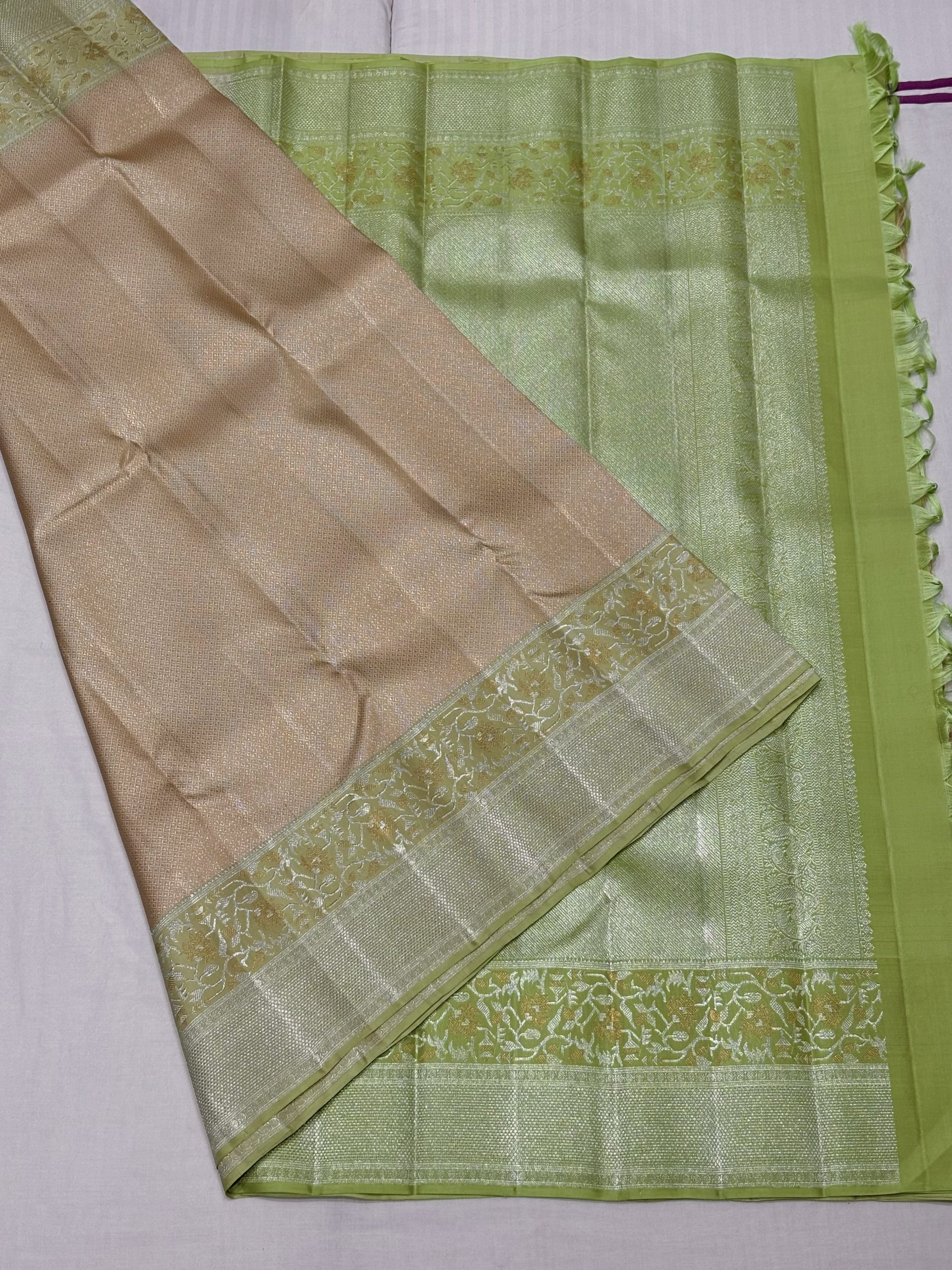 Pure bridal kanjivaram saree in ivory and pista green with zari brocade and elegant paithani work in the border.