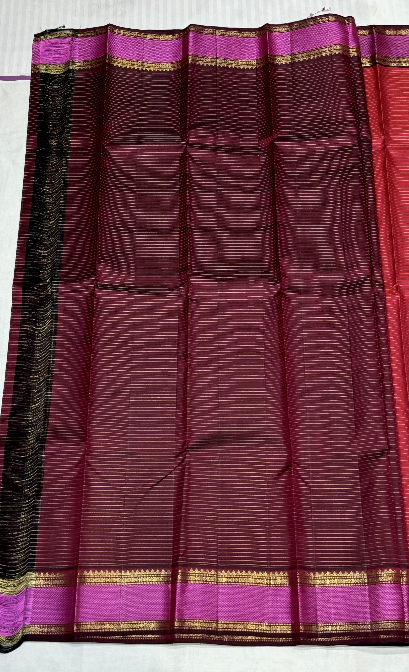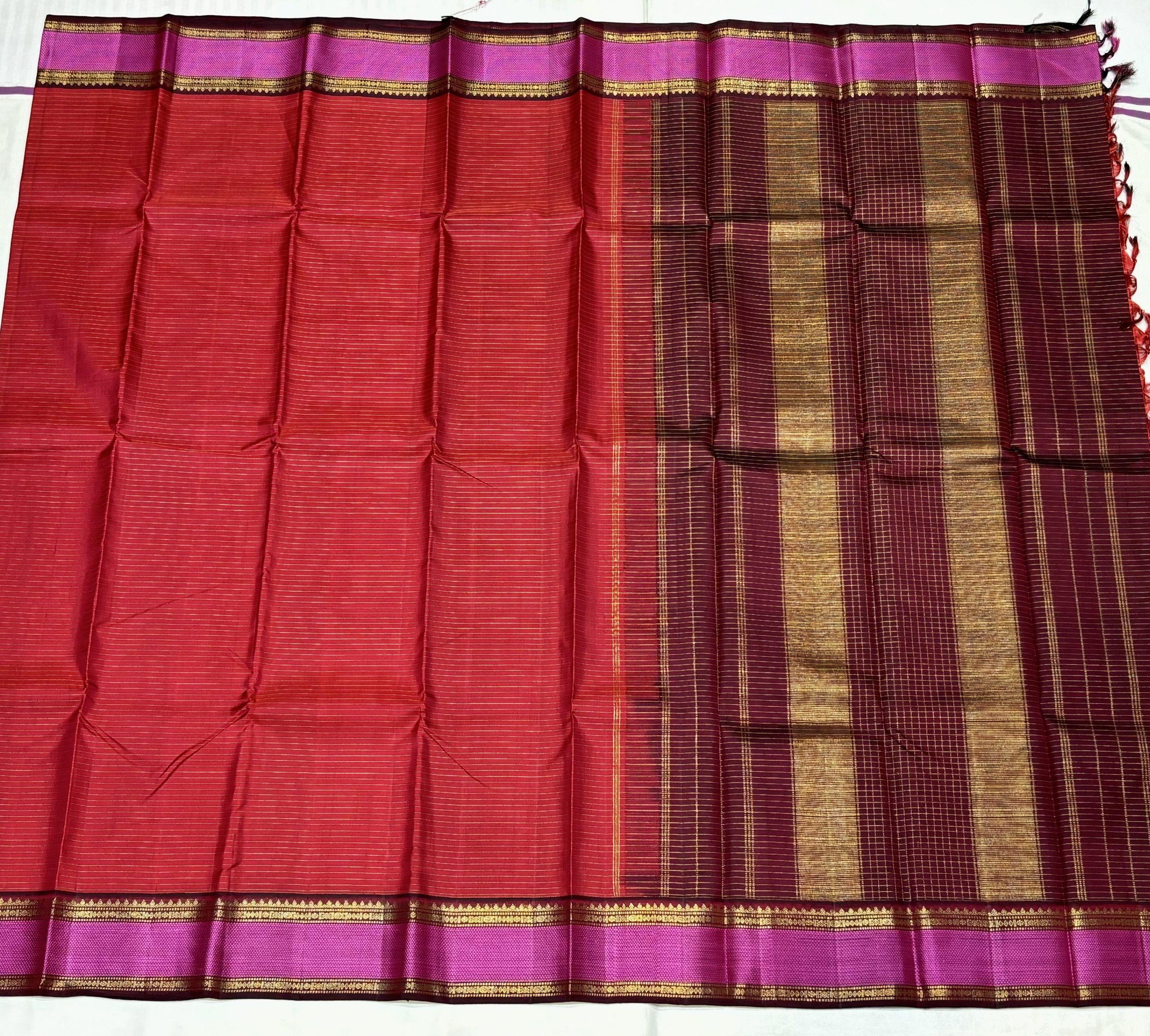 A symphony of pure silk and zari! The vibrant red with a rich contrast maroon border carved with pink thread motif, beautiful vairaoosi zari stripes running all over the body, makes this special kanjivaram saree a must-have in your festive wear wardrobe.